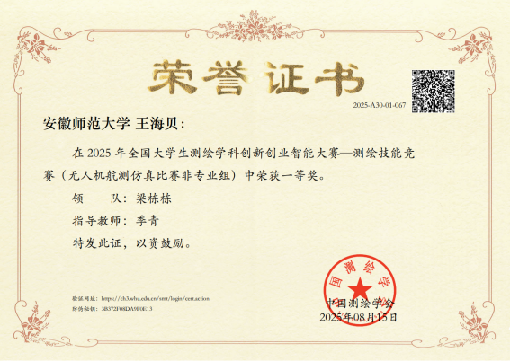 其中,2022级地信专业本科生李钊博、刑芮菡、2024级地信本科生凌启尧获得科技论文竞赛一等奖,指导老师为施开放;2023级地信专业本科生王海贝获得无人机航测仿真比赛一等奖,指导老师为季青;2023级地信专业本科生唐丹丹获得无人机航测仿真比赛二等奖,指导老师为梁栋栋。