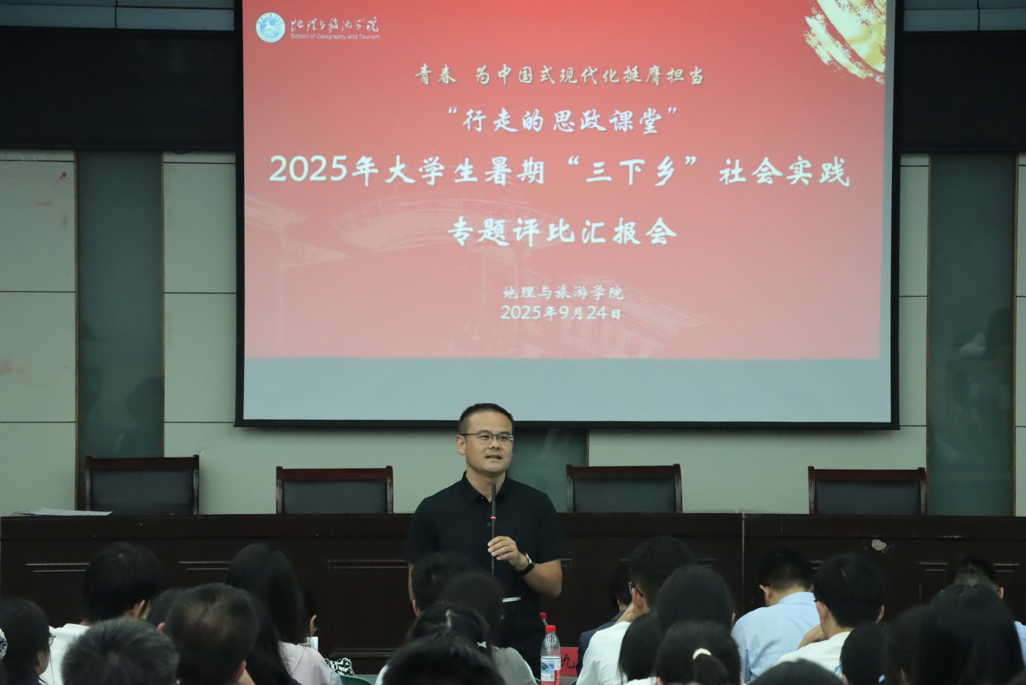 为全面总结2025年“行走的思政课”大学生暑期“三下乡”社会实践成果,生动展示各课程团队的实践成效与育人实效,进一步深化实践育人品牌内涵,9月24日下午,地旅学院在实验楼101报告厅举行暑期社会实践专题评比汇报会。学院党委副书记付勇、地理科学(师范)专业教师苗雨青、旅游管理专业教师王咏、土地资源管理专业教师董婷、地理信息科学专业教师季青、城乡规划专业教师朱玮林、学院团委以及各专兼职辅导员代表担任本次会议评委,实践团队队员、各年级学生代表观摩学习。