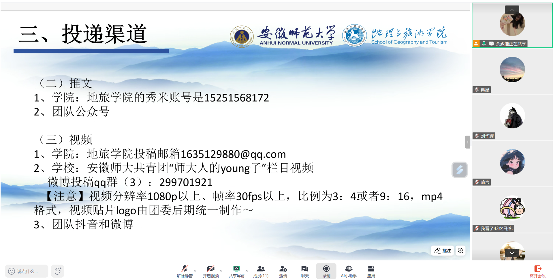 随后,副队长余淑佳对于团队宣传的一些具体事宜作出解释,包括人员分工、宣传要求、投递渠道等方面,对新闻稿、推文、视频的质量与数量都提出了严格的要求。余淑佳指出,团队的宣传任务必须高质量、高标准地完成。困难方显坚韧,险阻方显智慧。相信在接下来的调研过程中,每一位队员都能砥砺德行,圆满完成调研任务。