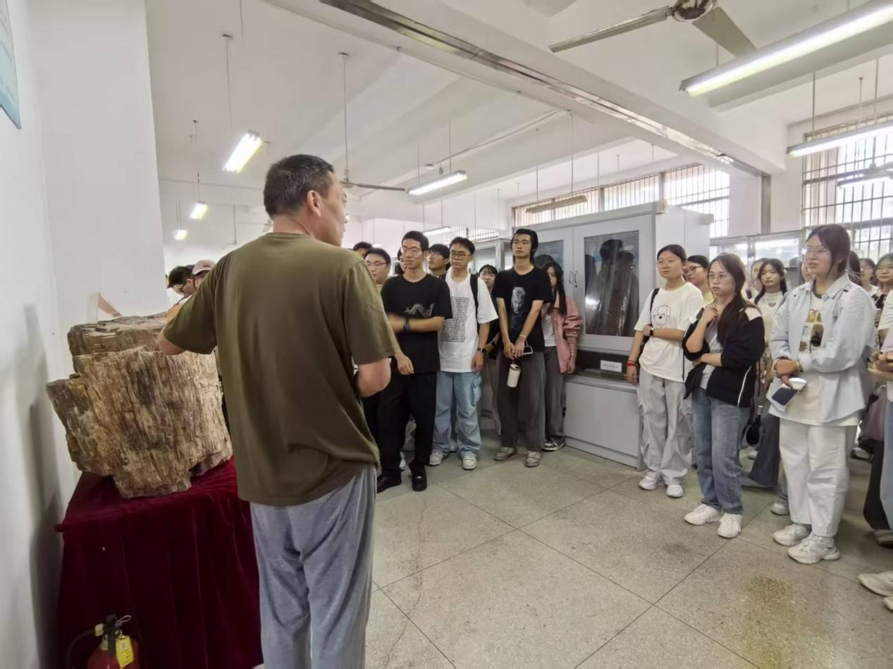 活动伊始,杨立辉老师简要介绍了实验室的基本情况与各类标本的地质背景。随后,同学们依次观察了来自不同地质时期的代表性标本。在一块巨大的硅化木化石前,杨老师讲解道:“这片区域在亿万年曾是一片茂密森林。经过长期的地质作用,树木的有机质逐渐被二氧化硅替代,最终形成硅化木。它是我们解读古气候与古环境的一本‘石头日记’。”